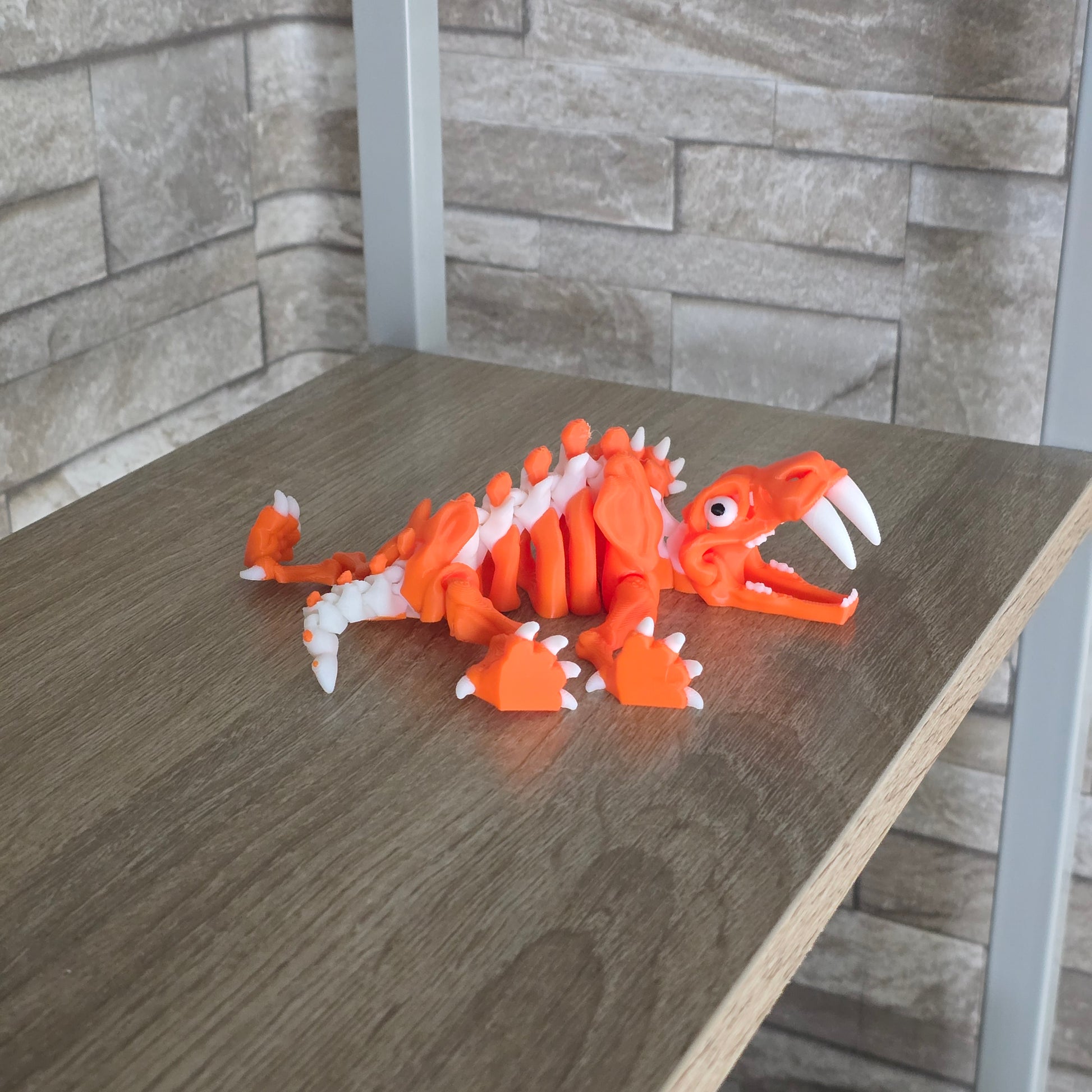 Bring prehistoric fun to your fingertips with this vibrant orange and white Articulated Sabretooth Dinosaur fidget toy. Its movable joints and opening, closing mouth provide endless playful squeezing and clicking, perfect for keeping hands busy and imagination roaring. A delightful twist on classic fidget toys that combines tactile satisfaction with a splash of Jurassic adventure.